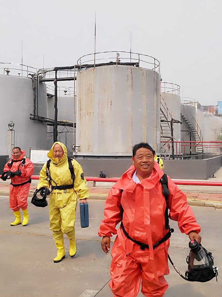硝基苯車間巡檢員在例行巡檢時(shí)發(fā)現(xiàn)儲(chǔ)罐區(qū)苯三號(hào)罐閥門泄露,用對(duì)講機(jī)立即報(bào)告車間安全值班員。車間班組維修人員當(dāng)即到現(xiàn)場(chǎng)搶修,由于閥門泄露情勢(shì)比較嚴(yán)重,黃色的苯霧蔓延,隨時(shí)會(huì)發(fā)生著火危險(xiǎn)。帶隊(duì)班長(zhǎng)立即請(qǐng)示車間搶險(xiǎn)防爆隊(duì)支援搶修,在防爆搶修過程中,事態(tài)嚴(yán)重,一人暈倒。車間搶險(xiǎn)隊(duì)長(zhǎng)立即上報(bào)虹橋公司值班調(diào)度。值班調(diào)度迅泄漏應(yīng)急救援預(yù)案,各應(yīng)急救援小組人員迅速奔赴現(xiàn)場(chǎng)。虹橋公司搶險(xiǎn)防暴隊(duì)人員立即開啟四個(gè)應(yīng)急消防水泵,伴隨著警報(bào)聲,白色的水龍從四個(gè)方向“箭”似噴射向苯儲(chǔ)罐和泄露罐閥門著火點(diǎn),苯霧迅即被稀釋,搶修人員成功對(duì)泄漏閥門進(jìn)行了堵漏;同時(shí)保衛(wèi)警戒組拉起了隔離帶,勸導(dǎo)、疏散閑雜人員;醫(yī)療救護(hù)組抬出受傷人員至安全區(qū)迅速進(jìn)行初期救護(hù)……整個(gè)救援搶險(xiǎn)緊張有序地進(jìn)行演練完成。